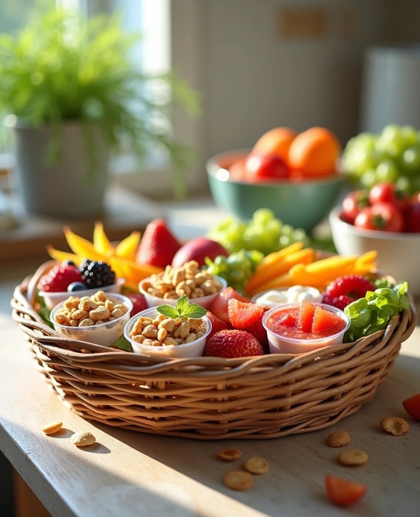 Fill a basket or container with pre-portioned snacks like nuts, fruits, yogurt, or veggie sticks.